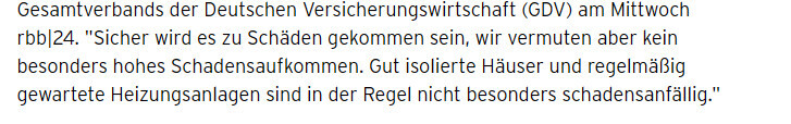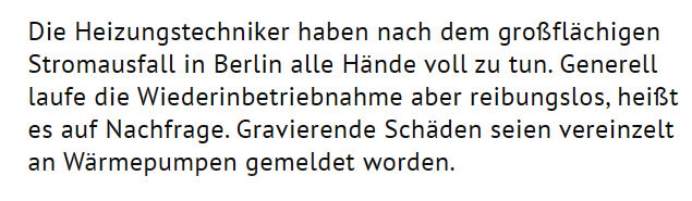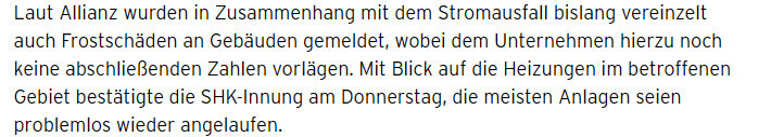 Es sind wohl eiige Schäöden an Heizungsanlagen und Rohrleitungen durch den Stromausfall entstanden. https://blackout-news.de/aktuelles/frost-schaeden-nach-blackout-strom-wieder-da-viele-heizungen-bleiben-trotzdem-aus/1. Für den Link gibt es eine Verwarnung. Also aufpassen.2. Das sehen die Versicherer aber anders. Der GDV sagt: