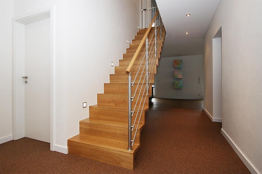 - Weitere Idee "Zweiholmtreppe zwischen Wänden" mit LED-Spots an der Wandseite und einseitigem Handlauf. Ähnlich wie in diesen Bildern: