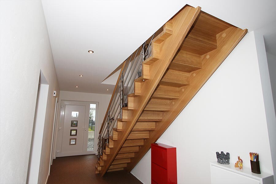 - Aufgesetzte Wangentreppe in Faltwerkoptik mit Geländer. Der Aufpreis beträgt hier ca. 14.000,- für die komplette Treppenanlage. Beispielbilder: