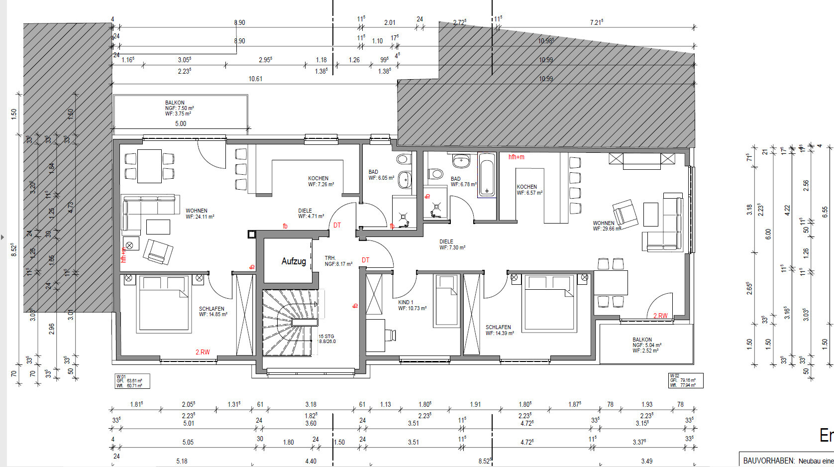 Vielleicht könnte man der Wohnung im Staffelgeschoss statt 2 Bädern und ein Abstellraum ein 2. Kinderzimmer/Büro gönnen.
