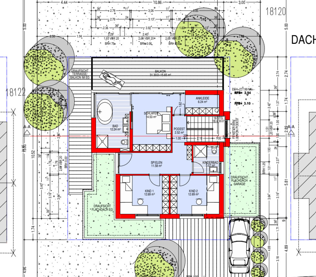 Der Türenkonflikt bei dem Micro-Eingangsbereich kann nicht des Architekten Ernst sein eben so wie das enge Vorbeidrücken an den geparkten Autos zum Eingang. Abgesehen davon, dass man da vlt. bald ein Kinderzimmer weniger bräuchte oder ne neue Ehefrau suchen müsste ist das völlig unpassend; dies bei allem Verständnis zu gewünschter Hauseingangsnähe des Parkplatzes.