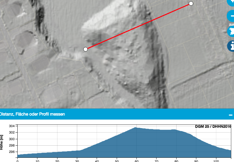 die Vermutung, dass das Waldstück auch langfristig nicht anderweitig genutzt wird, kommt daher, weil das Waldstück selbst zu seinem Zentrum hin auf einem Hügel steht, der zu allen Seiten relativ stark abfällt. Und dahinter im Westen fällt das Niveau sogar nochmal weiter (ein ehemaliger Steinbruch schließt sich dort an). Sieht man auf dieser Reliefkarte gut: