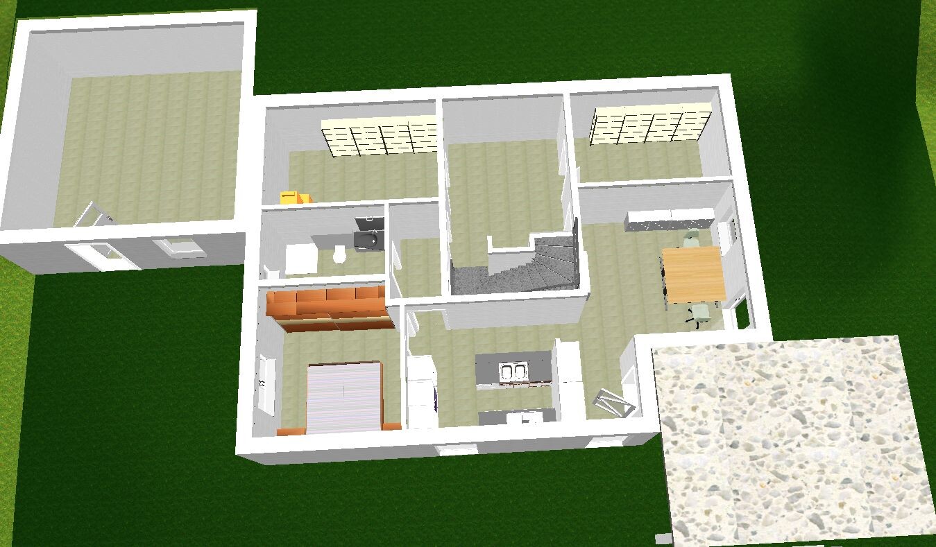 Ich habe mal ein bisschen geschoben, wie ich mir das vorstellen könnte. Ich könnte mir auch ein versetztes Pultdach vorstellen. Dächer kann ich aber nicht so toll, daher eher als Anschauungsskizze zu sehen .