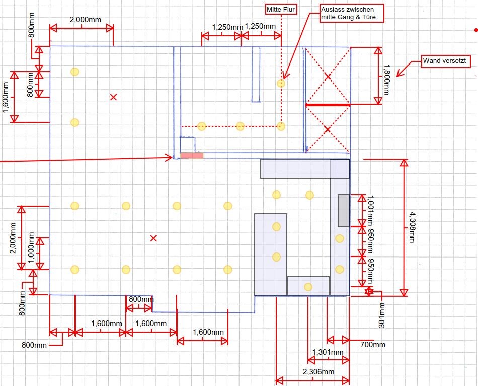- Da wir einen Oberschrank haben ist die Aufteilung der Deckenspots erschwert. Unter den Oberschrank würden wir eine Beleuchtung installieren. Die anderen Lichter sind auf den Arbeitsplatten oder im Gang verteilt.