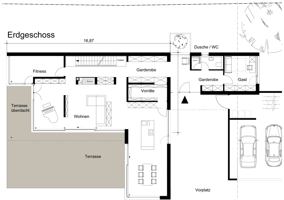 Wir haben versucht, die Eingangssituation zu entschärfen und freundlicher zu machen. Wir haben den Fahrrad- und Müllraum hinter die Garage geschoben und somit einen breiten Eingang geschaffen, der unter Umständen auch mal als Stellplatz für ein drittes Auto dienen kann.