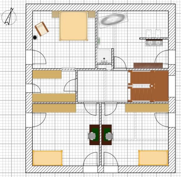 - im Norden soll Euer Garten + Terrasse sein. Dann funktioniert Euer Wohnzimmer so nicht. Ihr müsst hinter dem Sofa rumturnen, um auf die Terrasse zu kommen. => Fenster und Tür tauschen oder aufs Fenster ganz verzichten und nur die Tür an Stelle des Fensters. Die auf der Nordseite "eingesparte" Tür/Fenster noch auf die West-Seite bringen => Mehr Licht/Sonne/Wärme einfangen!