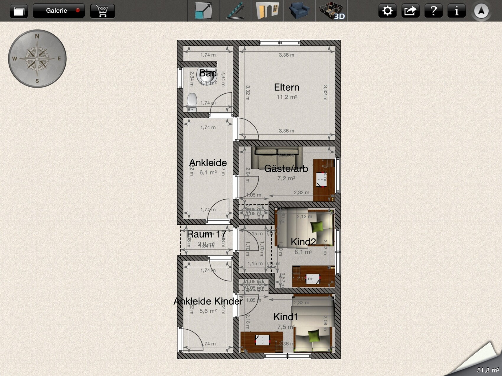 Sorry, aber das ist wirklich der reine Murks ... in welchem Zimmer sollen denn 2 Kinder schlafen können? Und dann spielen? Und dann noch die Nordrichtung der Kinderzimmer. Und da hilft auch kein Augenzwinkern.
