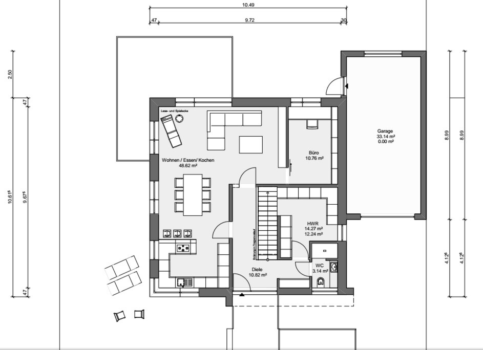 Wir haben noch etwas Bauschmerzen wie es aussieht, wenn man im Eingang direkt auf die Treppe nach oben schaut. Eine gewinkelte Treppe ist nur leider etwas platzraubend bei dem schon schmalen Flur!