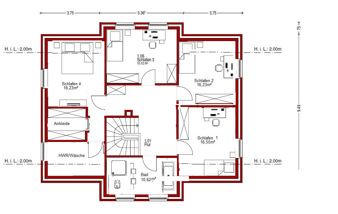 Grundriss eines Etagenplans mit Flur, vier Schlafzimmern, Bad, Ankleide und HWR/Wäsche.