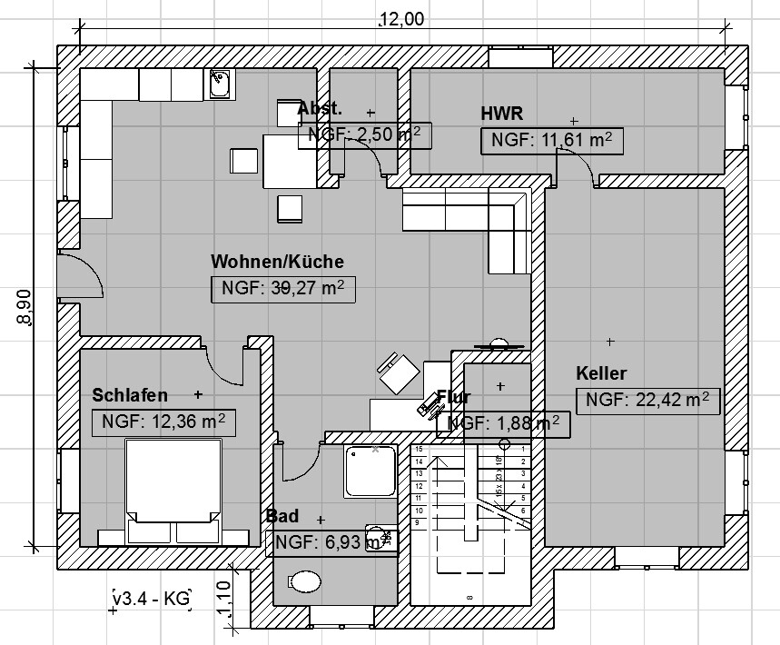 UG: Der Einwand mit der Waschmaschine stimmt auf jeden Fall, der Weg ist recht lang. Wir überlegen allerdings, ob wir hierfür nicht einen anderen Platz finden würden oder diese dann in den Keller nach der Treppe rechts verfrachten. In der EWL ist die Küche links oben in die Ecke gewandert und die Couch mit TV in die Mitte. Das Schlafzimmer ist nun neben dem Bad, damit bei heftigem Druck auf der Blase nicht durch die komplette Wohnung gelaufen werden muss . Abstellkammer ist klein, wäre noch etwas größer möglich oder gleich ganz weglassen und lieber einen Schrank mehr. Zugang zum Hauswirtschaftsraum, Keller oder Flur für die Wohnung gibt es nicht. Hier bin ich noch bei der Klärung mit der KfW, denn da ist die Lage bezüglich so einer Türe noch nicht ganz klar...