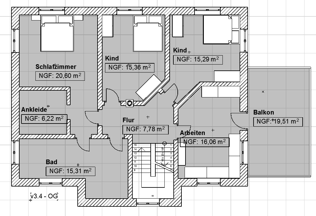 OG: Aus dem Eingang haben wir einen Balkon gemacht, der fetzt . Wir hatten zwar beide die Meinung, dass wir oben keinen Balkon brauchen (wann nutzt man den wirklich oben), aber bevor wir da ein Dach darauf machen, können wir auch einen Balkon daraus machen. Die Kinderzimmer sind jetzt fast gleich groß, das Arbeitszimmer ist kleiner geworden. Allerdings sind wir der Meinung, selbst wenn wir zwei ungleiche Kinderzimmer hätten, dann würde einfach das ältere Kind das größere Zimmer bekommen. So war das bei uns früher auch und ich habe meine Eltern deswegen nicht vermöbelt . Die Ankleide ist größer als vorher, das Bad etwas kleiner (Außenmaße des Hauses sind insgesamt kleiner geworden).