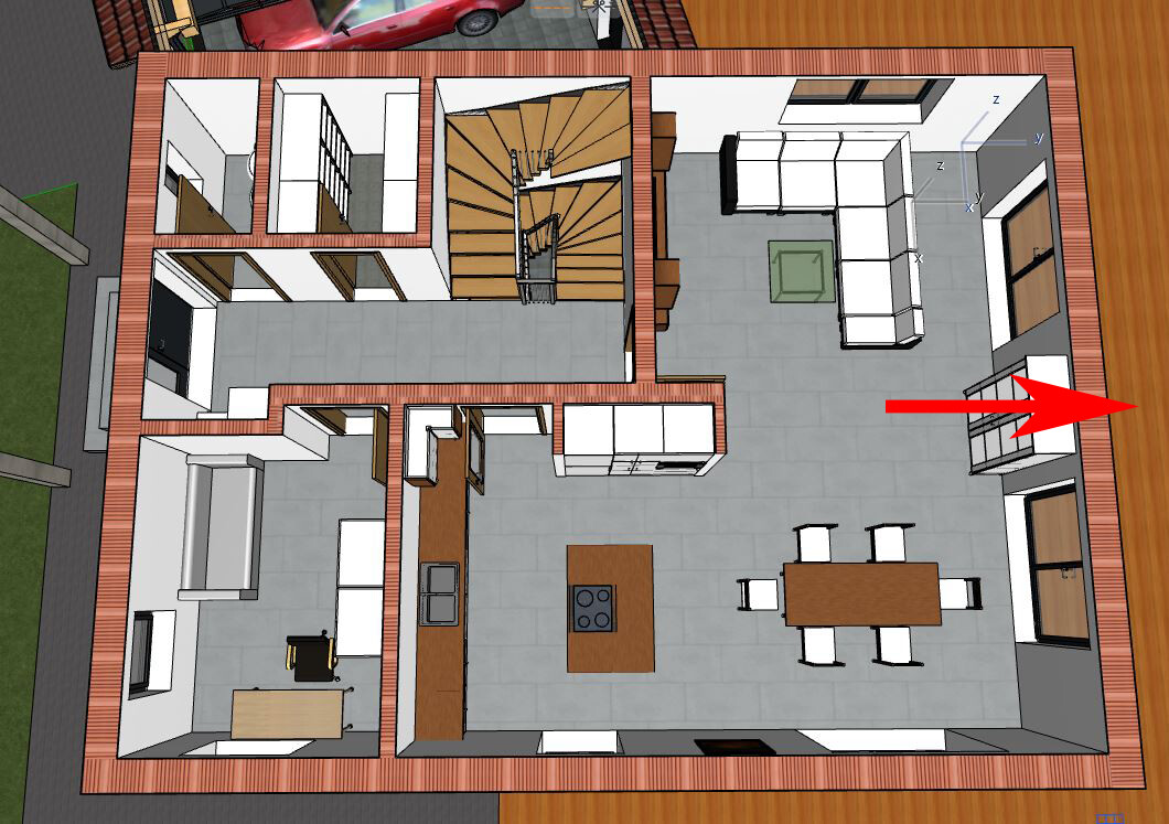 Worüber ich an Eurer Stelle noch mal nachdenken würde, ist die Position der Terrassentüren. Wie Du in Deiner Möblierung selber siehst, kannst Du dort nur schlecht an den Möbeln vorbei, um hinaus zu treten. Besser wäre eine Position in der Mitte des Raumes (Pfeil):