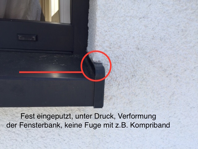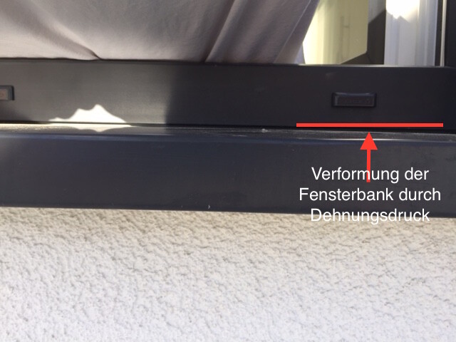Ich habe nun festgestellt, dass sich bei hohen Temperaturen meine Alufensterbänke nach oben biegen, da der Fassadenbauer die Fensterbänke (haben eine einfache Endkappe leider keine mit Dehnungskedern) fest ohne Fuge eingeputz hat. Das Problem, dass nun nach ein paar Monaten, 1-2 der Bänke so verformt haben, dass das Gefälle verloren gegangen ist und nach dem Regen das Wasser innen steht (was ich auch erst gemerkt habe nachdem ich das Gewerkeloch zwischen Bank und Fassade abgedichtet habe). (siehe Fotos).