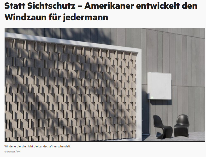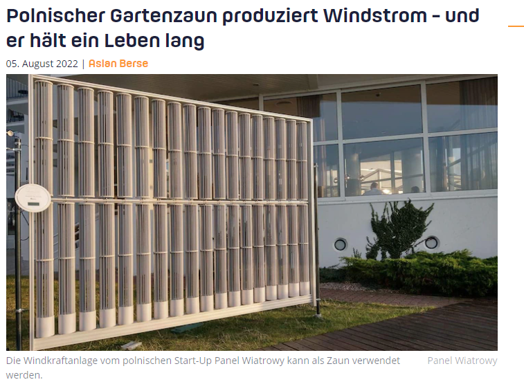 Dasa eine war wie ein Zaun (Spanien) - das andere nutzt die Strömungen die an Gebäuden sowieso entstehen (So Auf- oder Fallwinde, weiß ich nicht mehr genau) Leider muss das zweite aufs Dach und steht daamit in Konkurrenz zur Photovoltaik. Aber die Zaungeschichte klingt für mich super interessant. An der Straße ist immer Wind möglich.Das sind alles Start Ups, die noch lange nicht serienreif sind - da stehen maximal einzelne Pilotanlagen. Geh mal davon aus, dass es noch einige Jahre dauert, bis es soweit ist, dass man sich die Dinger kaufen kann (egal ob es die spanischen, polnischen oder US-Anlagen sind). Und preislich? Wie bei jeder neuen Technologie wohl erst mal nicht so richtig konkurrenzfähig.Spanische Turbine - Stand April 22 nur eine einzige Prototypenanlage