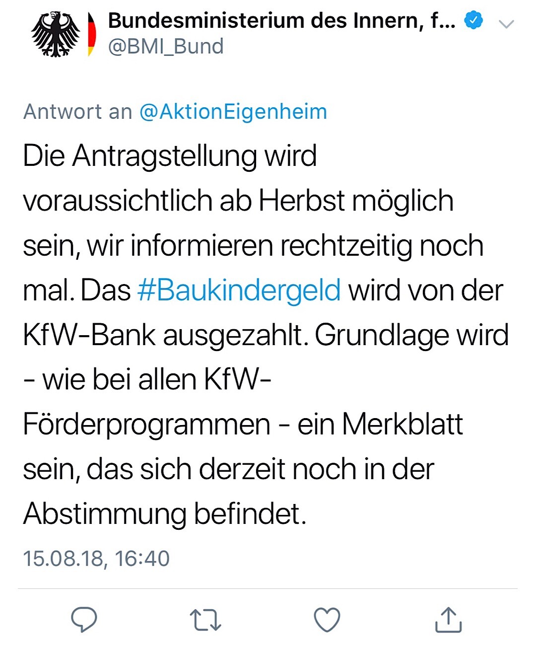 Auf selber Seite findet sich eine Karte, die den Anteil des Baukindergeldes für 2 Kinder an den gesamten durchschnittlichen Baukosten für einen Neubau 2018 berechnet. Neubau heißt: 140m², 5 Zimmer, Keller, 600m² Grundstück, mittlere Ausstattung.