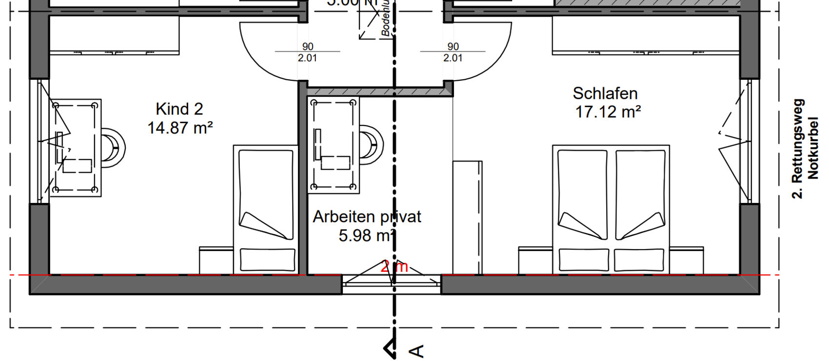 Die letzte Option (Wand verschieben) die uns noch eingefallen ist, die Länge der Mittelpfette ja das Problem ist, warum nicht einfach die Wand des linken Kinderzimmers nach rechts rücken, sodass die Gesamtlänge der Mittelpfette genau 600cm beträgt. Einziger Nachteil hier, Kinderzimmer sind jetzt asymmetrisch und Schreibtisch wandert weiter in den Raum. Dadurch können wir ggf. den Schrank als Sichtschutz auch wieder nicht mehr platzieren.