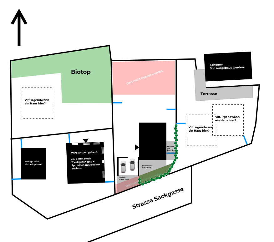 Das Grundstück hat im Grunde ein gute Lage, ist nach Süden in zweiter Reihe zu einem See. Gerade deshalb, wollen wir hier auch das Optimum (auch für uns) rausholen. Ein großer Südgarten der auf der Westseite ein riesige Hausseite mit Fenstern vs. komplett freier Nordgarten für was auch immer...