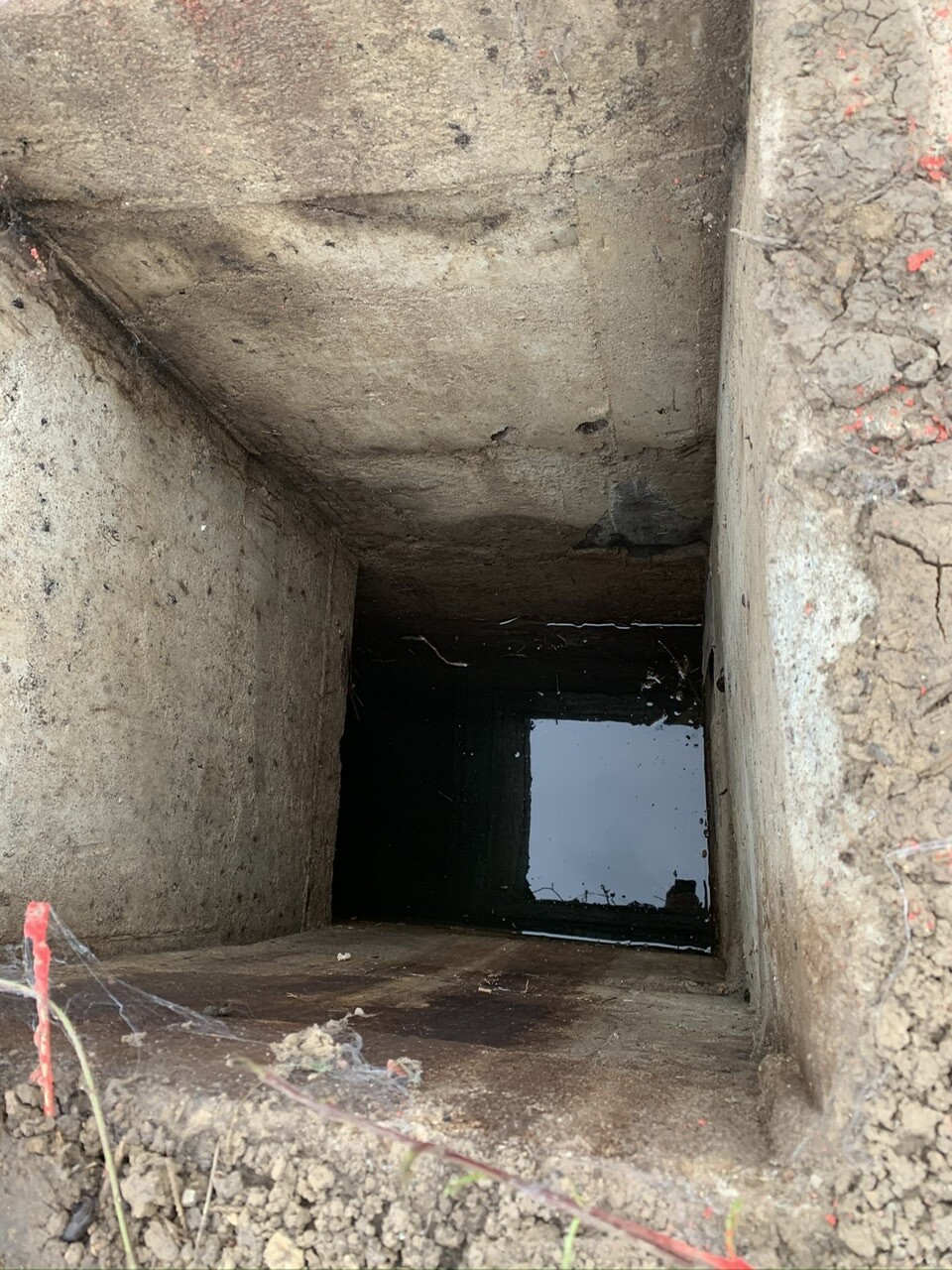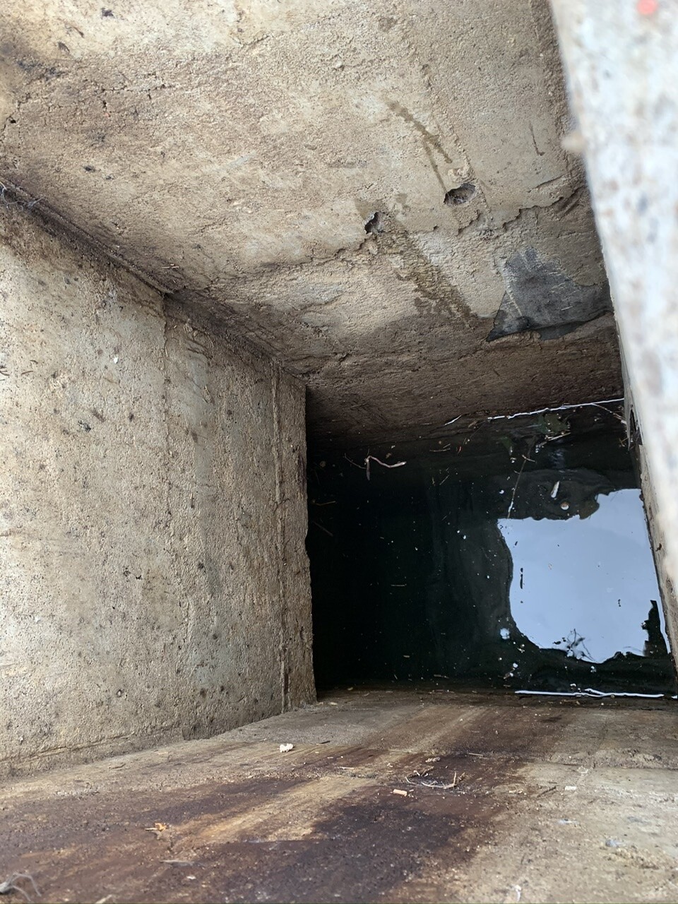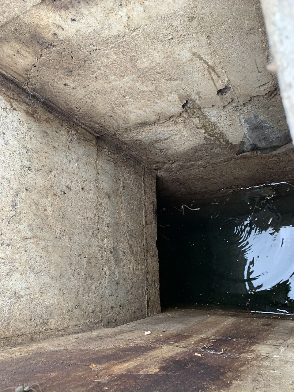 - es ist nicht nur ein senkrechter Schacht, sondern es geht auch noch in eine Richtung ein waagerechter Kanal ab (falls relevant: in Richtung Straße = die Richtung, in der der Bach liegt)