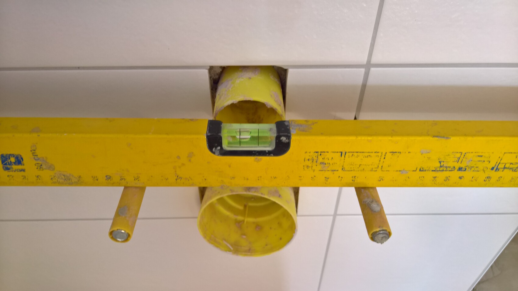 Gelber Rohrdurchgang in Fliesenwand mit Wasserwaage während Innenausbau-Montage