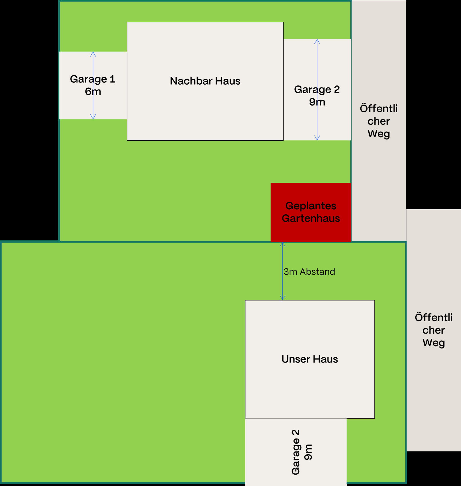 Er plant auch noch ein Gartenhaus. Wenn ich mir allerdings die Grenzbebauung anschaue, löst das Gartenschuppen Abstandsflächen aus und muss rechtlich sauber 3m (?) von der Grundstücksgrenze entfernt gesetzt werden, da er schon auf 15m Grenzbebauung kommt, oder? Ich habe es mal grob skizziert, proportionen passen nicht.