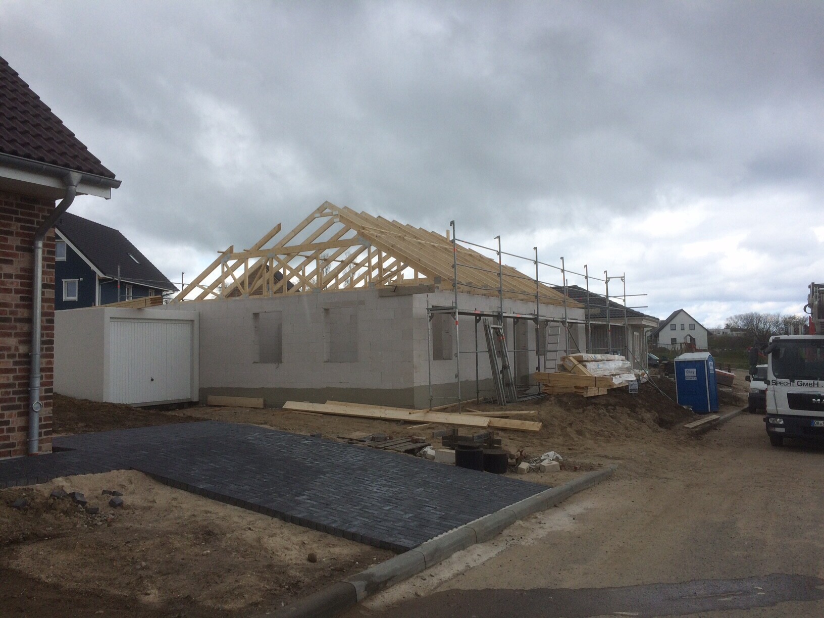 Rohbau eines Hauses mit Holz-Dachkonstruktion, Gerüst und Baustellenmaterialien