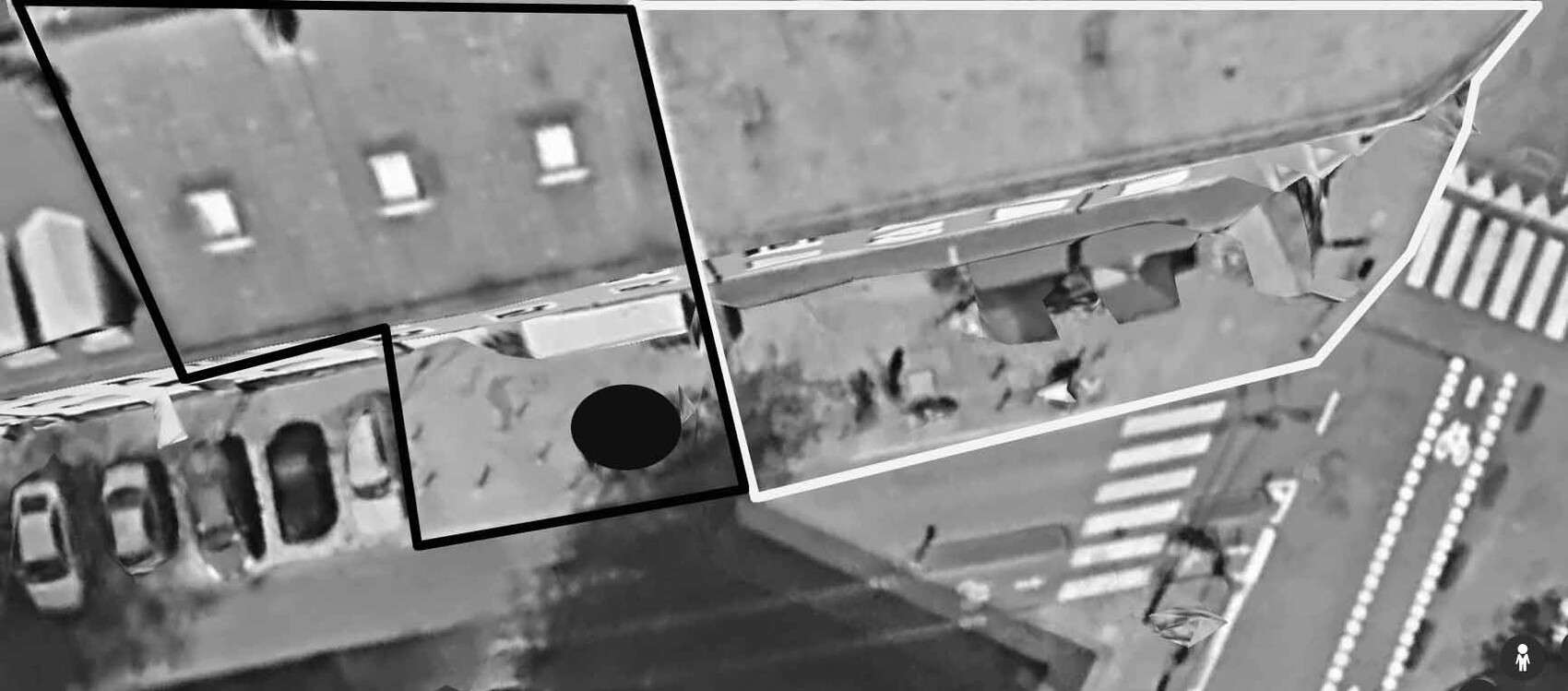 Hier noch ein Bild von der Örtlichkeit. Das schwarz eingezeichnete Haus ist unseres, der schwarze Kreis, da steht jetzt der Container und dort soll angeblich auch der Baukran aufgestellt werden. Das weiß eingezeichnete, ist das Haus vom Nachbarn, der Baut. Vielleicht ist jetzt die Situation und mein Unverständnis besser zu verstehen?