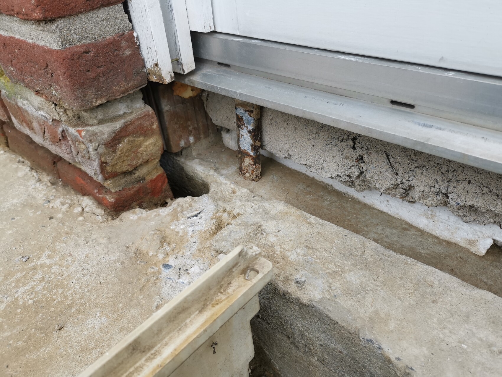 Die Fläche der Terrasse war bisher auf Sand gepflastert. Der Sand wurde im Bereich der Fenster mit Zement vermengt um wohl etwas Stabilität zu bekommen. Hat über die Jahre dazu geführt, dass der Estrich im äußeren nicht überdachten Bereich leicht feucht geworden ist sowie im Innenbereich einige Stellen an den Wänden leicht blühten.