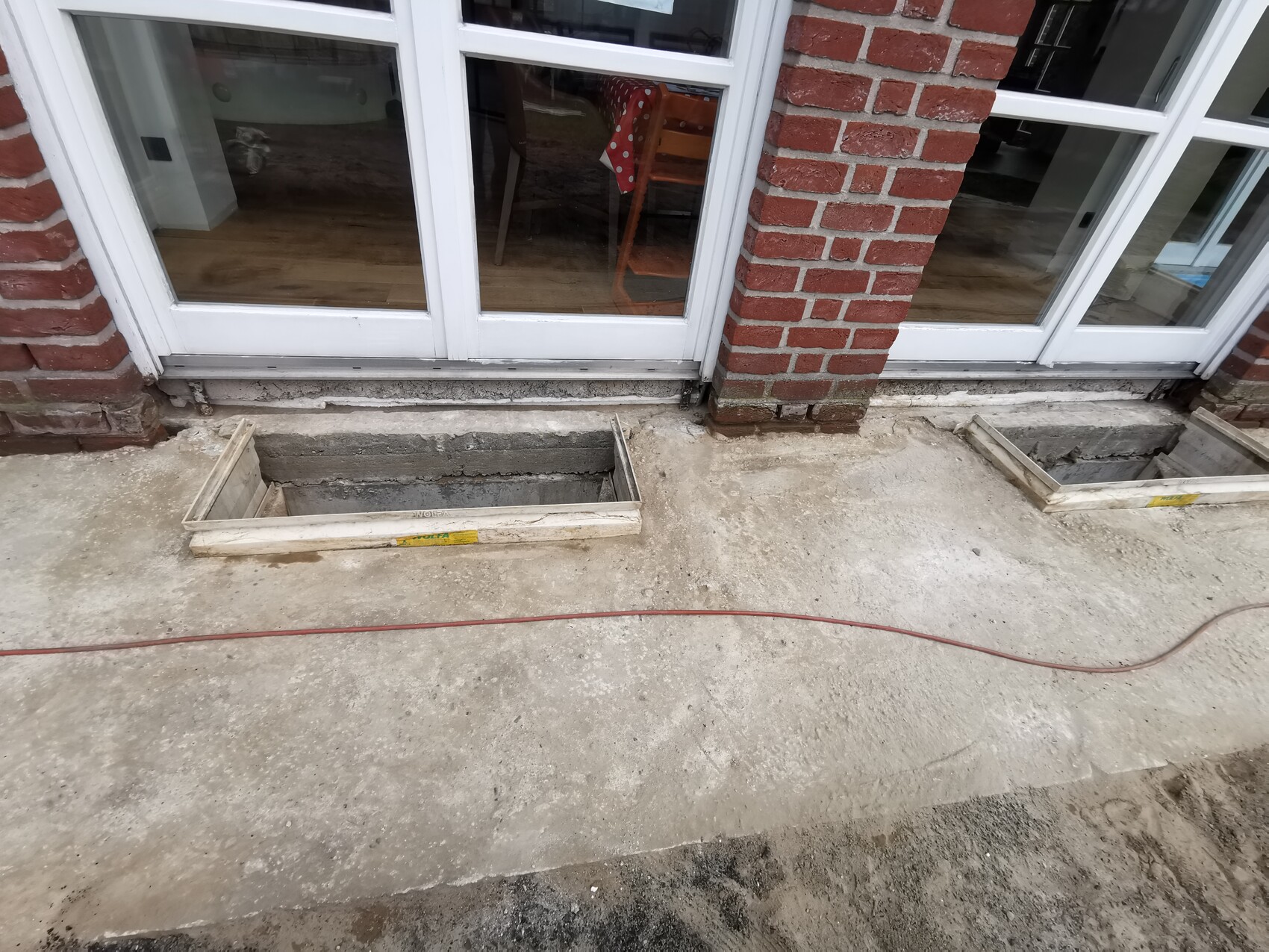Habe dann vor einigen Tagen die Terrasse an der Westseite entfernt damit die bodentiefen Fenster nach unten hin sauber abgedichtet werden können. Hier befinden sich auf der ganzen Länge 7 Fenster.
