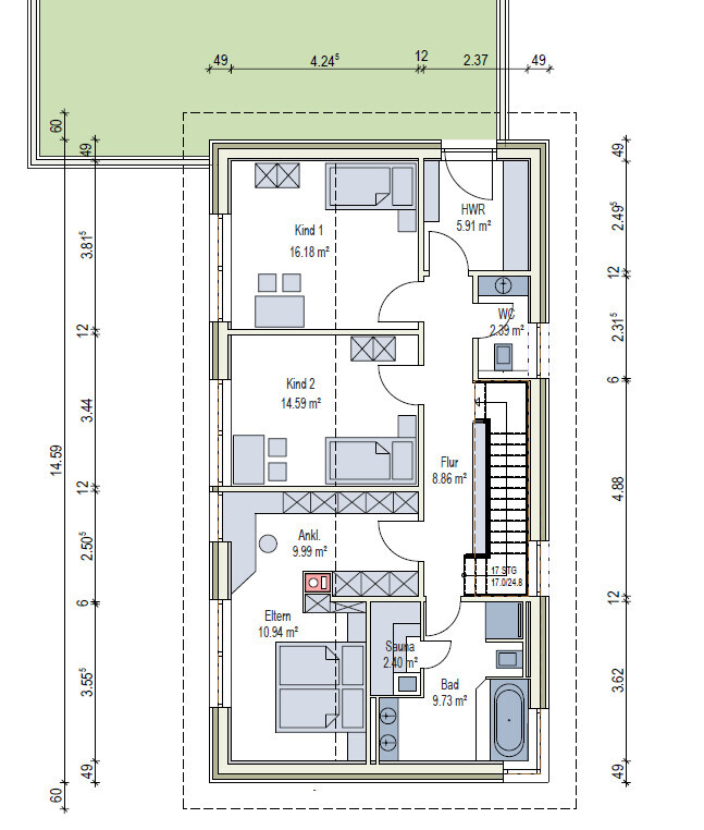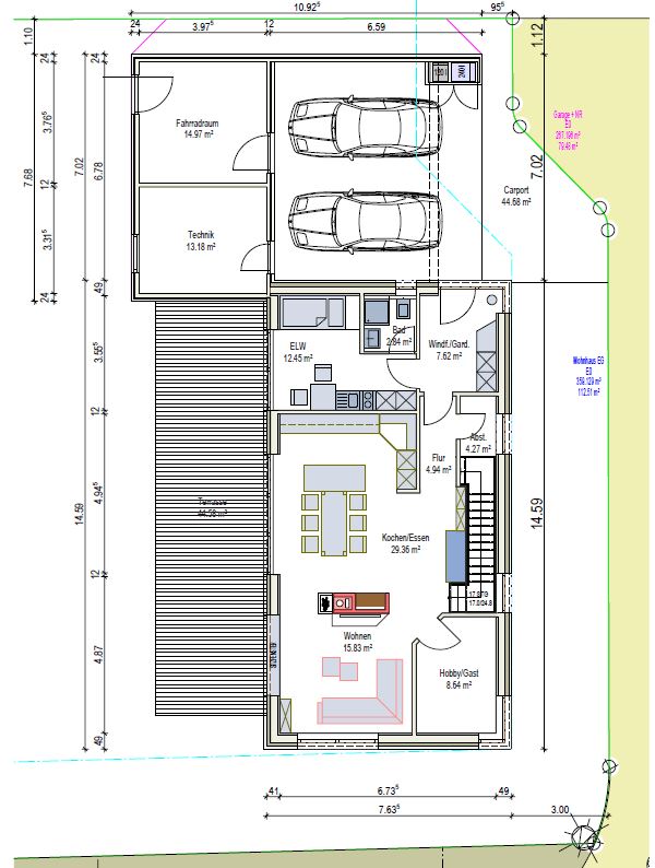 Das Zimmer mit "Hobby/Gast" brauchen wir eigentlich nicht. Hier würde ich das Haus nochmal 1,3m rein schieben. Dadurch könnten wir das Wohnen bis in die Ecke ziehen und die Einliegerwohnung universeller/größer gestalten. Dazu müssten wir aber die Treppe weiter nach vorne holen und drehen.