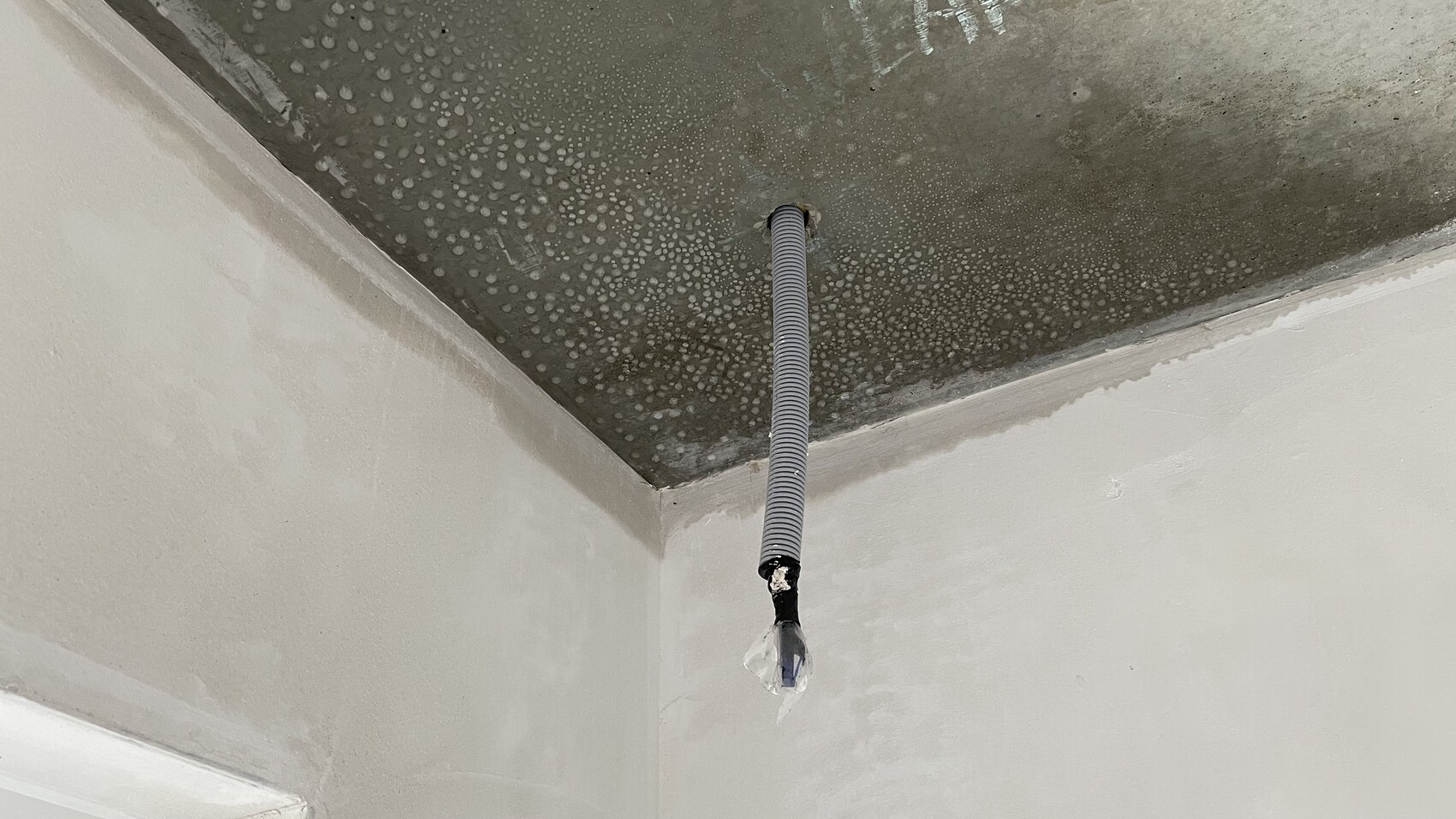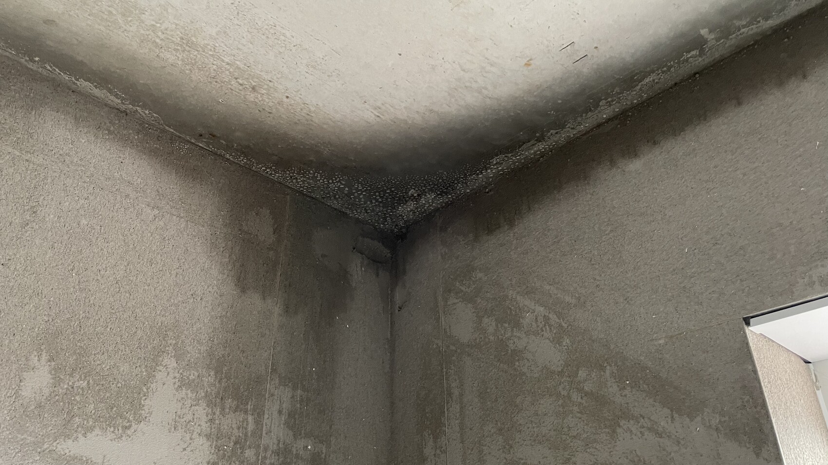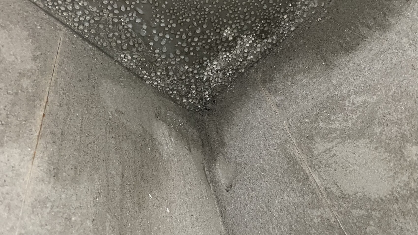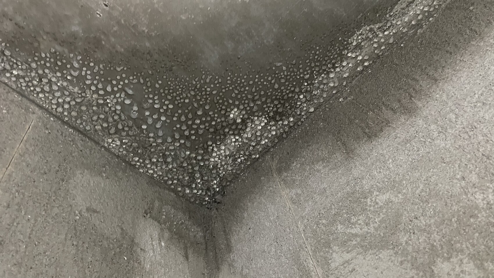 Als ich heute im Haus war, habe ich jede Menge Wassertropfen an der Decke genau an den Stellen gesehen, an denen auch die Außenseite die nassen Flecken aufweist.