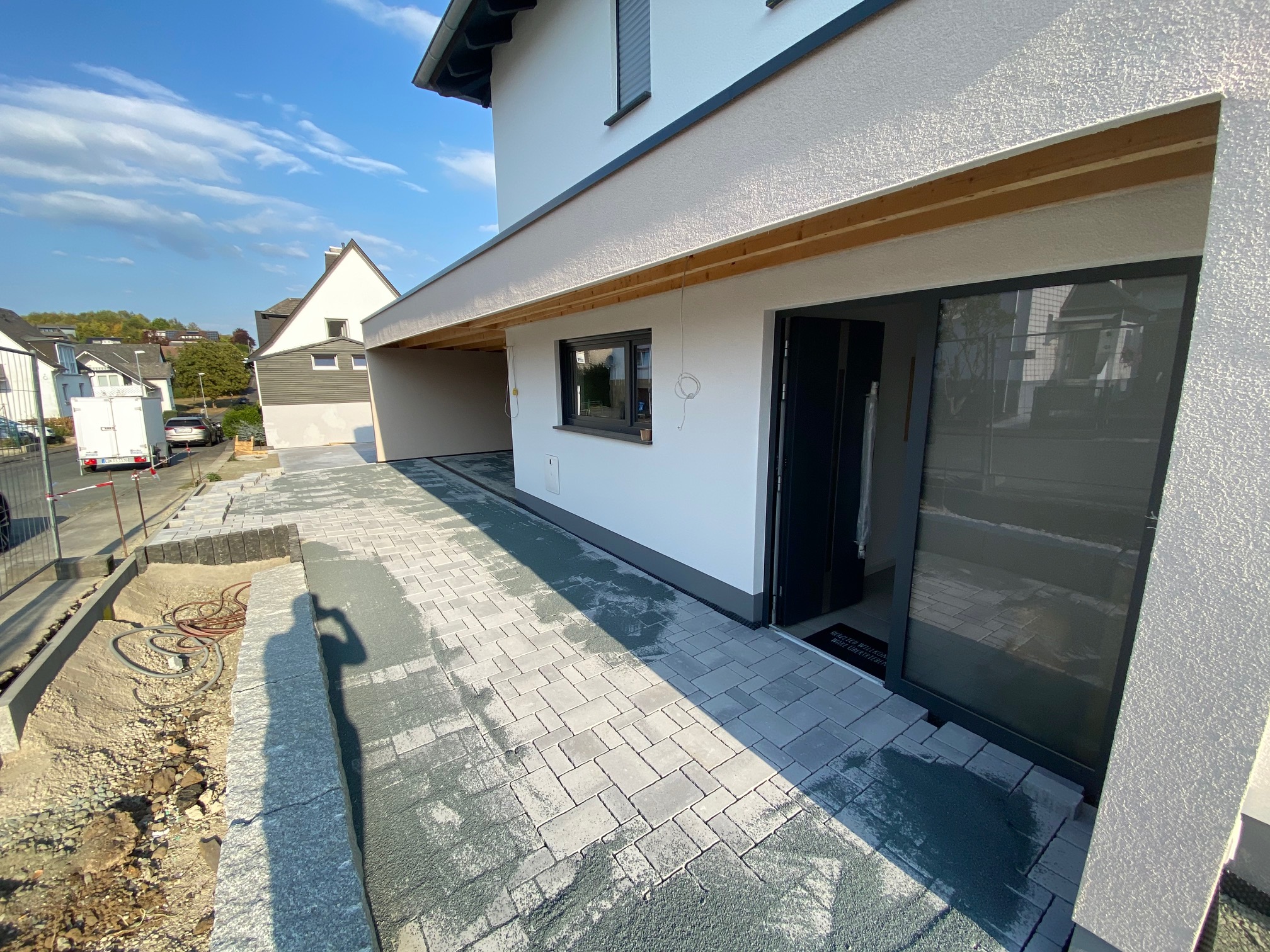 Angeschlossen wird das an der Außenzapfstelle am Haus. Ich habe unter den Pflastersteinen ein Abflussrohr zum Wasserhahn verlegen lassen, um später dann das wasserführende Rohr bzw. den Schlauch durchzuführen.