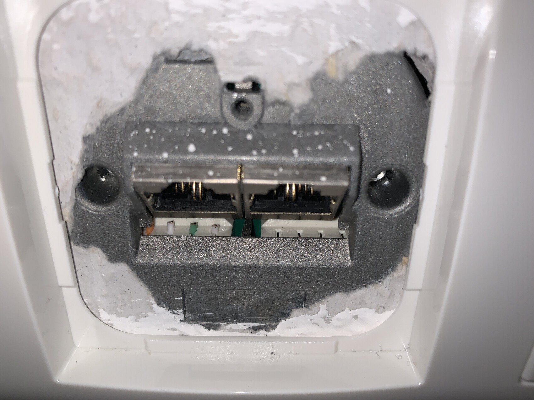 Leider wurde meiner Meinung nach diesbezüglich vom Bauherren nicht sehr weit mitgedacht. "Immerhin" gibt es eine Doppel-LAN-Dose im EG und eine im OG. Im Hauswirtschaftsraum, wo inzwischen auch das Glasfasermodem hängt, kommen zwei CAT.7 Patchkabel aus der Wand, die leider noch keine Stecker am Ende haben. Ich nehme an, sie stammen von diesen zwei Dosen.