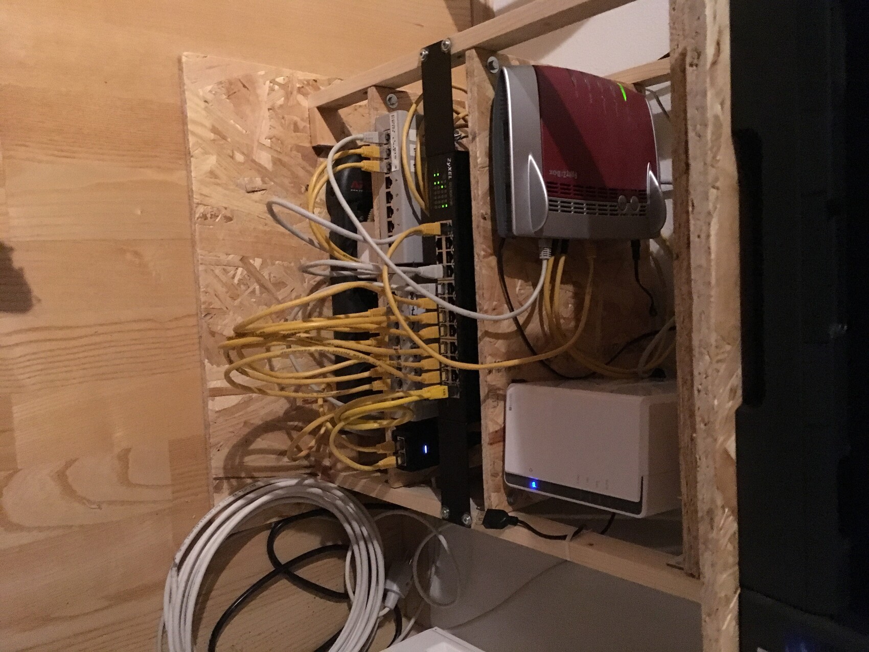 Anbei ein Bild meines Switch. Patchpanels sind schon 10 Jahre alt. Da hab ich nur mit 8 Ports angefangen. Patchkabel muss ich mal kürzer organisieren. Ist jetzt alles in einen Holzrahmen montiert. Ein richtiger Netzwerkschrank ist sicher empfehlenswert, aber ich habe für mich nichts passendes gefunden und somit wurds ein Eigenbau.
