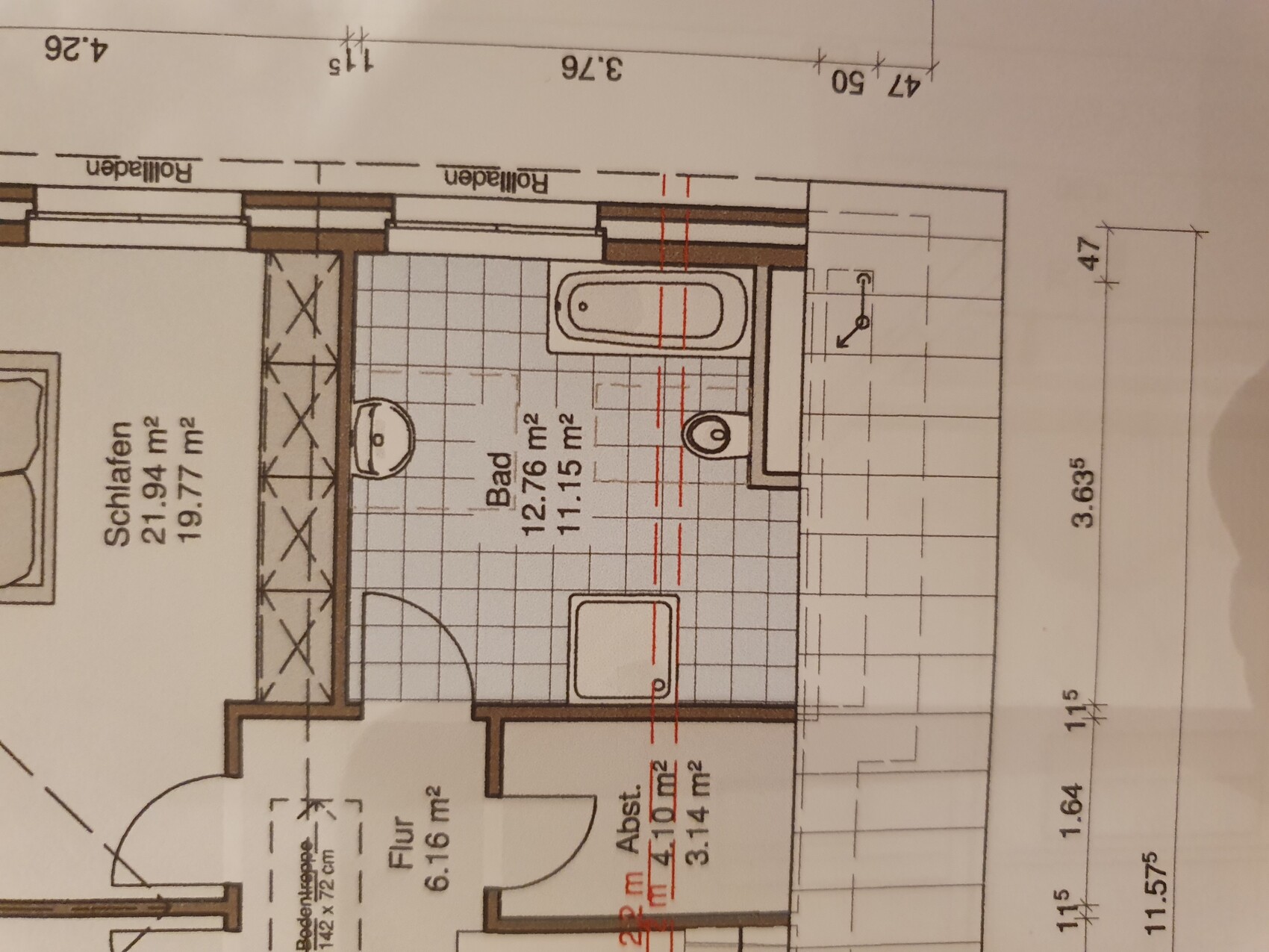 Am jetzigen Entwurf stört uns ein wenig die große Nische hinter der Dusche (evtl. Abstellraum erweitern?) und dass das WC direkt neben der Badewanne platziert ist.
