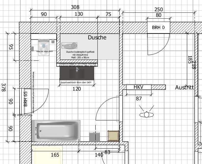 Finde ich auf den ersten Blick gefälliger. Der Duschbereich ist jetzt 205 x 95cm (vorher 160 x 90cm) , die "Spritzwand" bei 130cm (vorher 90cm). Die Dusch-Spritz Problematik sollte dadurch besser in den Griff zu bekommen sein, das Klo-Eck ist nach vorne nicht mehr so beengt, dafür aber einsehbarer. Hm? Wie findet ihr diese Variante?