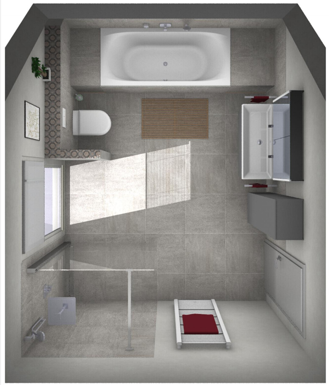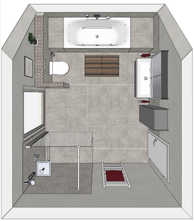 Wir haben eine ähnliche Größe. Ich mag aber kein geteiltes Bad. Hier mal unsere Variante.