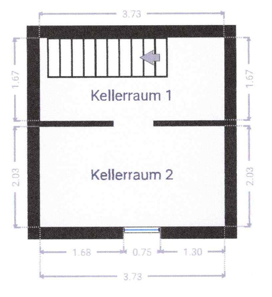 Grundriss eines Kellergeschosses mit zwei Räumen: Kellerraum 1, Kellerraum 2, Treppe links.