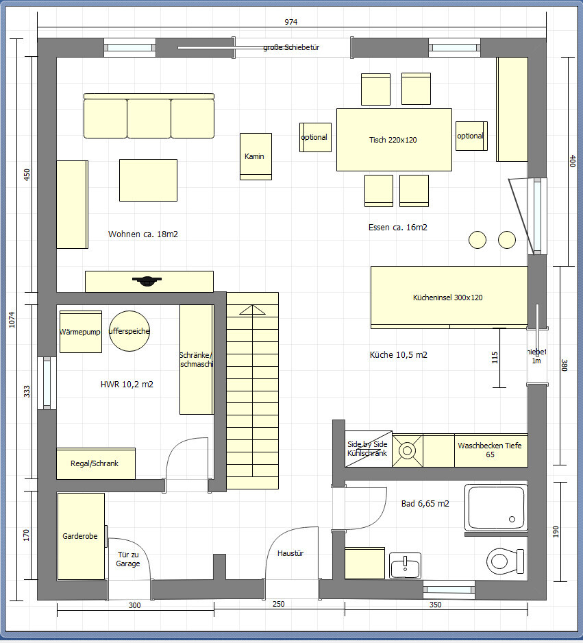 Mich erinnert das EG an eine Möbelhausfläche. Alles vom Eingang sichtbar auf dem ersten Blick. Und dazu die Treppe offen nach oben. Die Akustik wird wie in einem Parkhaus sein und kein Bora der Welt wird verhindern, dass man das Steak bis ins Schlafzimmer riecht.Naja, den Raum nach oben kann man ja abdichten bzw. vll kommt noch eine Tür rein und da die Tür jetzt unter der Treppe weg ist, kann man da ja auch eine Scheibe hochziehen. haydee 01.05.2021 19:56