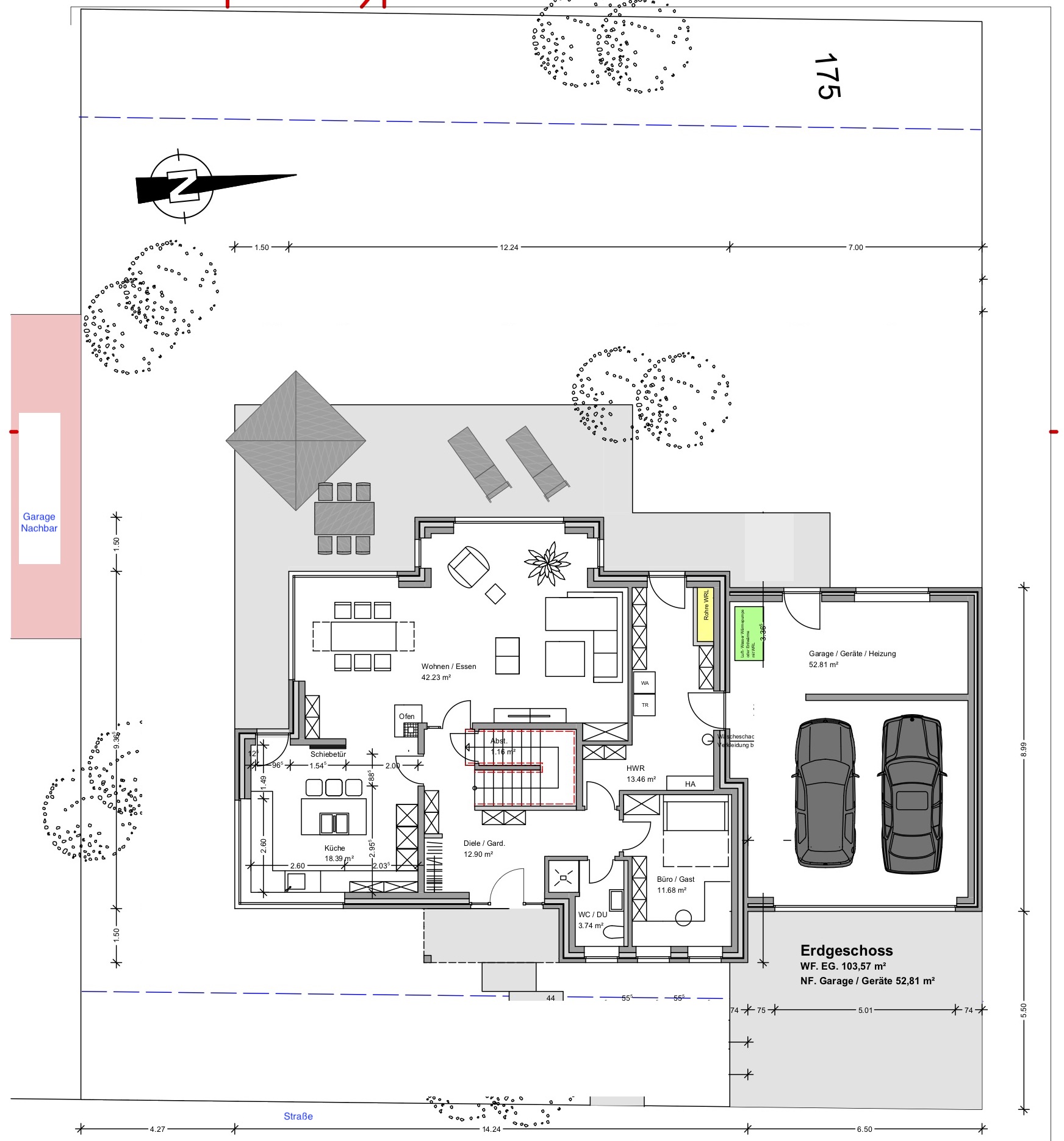 - Lage Küche: Meine Frau möchte gerne die Küche zur Straße haben, damit man mitbekommt, was da so passiert Mir ist das egal, wir haben hier auch viel diskutiert, aber sie hat sich durchgesetzt.Durch die großen Fenster in Richtung Osten dann auch schöne Morgensonne. Wir wollen gerne die Küche so arrangieren, damit wir auch dort Frühstücken können. Ebenfalls dann viel Fenster in den Süden. Derzeit wird die Ecklösung gezeichnet, aber das kann sich noch mal ändern nach Rücksprache mit dem Küchenstudio.