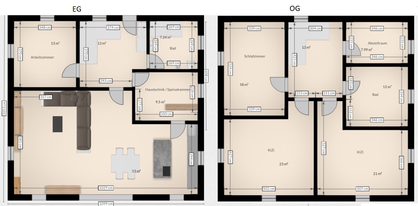 Anhand diverser Fertighäuser haben wir unseren eigenen Grundriss entworfen. Arbeitszimmer im EG soll groß genug sein, um es evtl auch als Schlafzimmer benutzen zu können. Das Wohnzimmer soll zum Süden hin, die Kinderzimmer gleich groß sein. Ob in den Abstellraum würden wir die Waschmaschine stellen