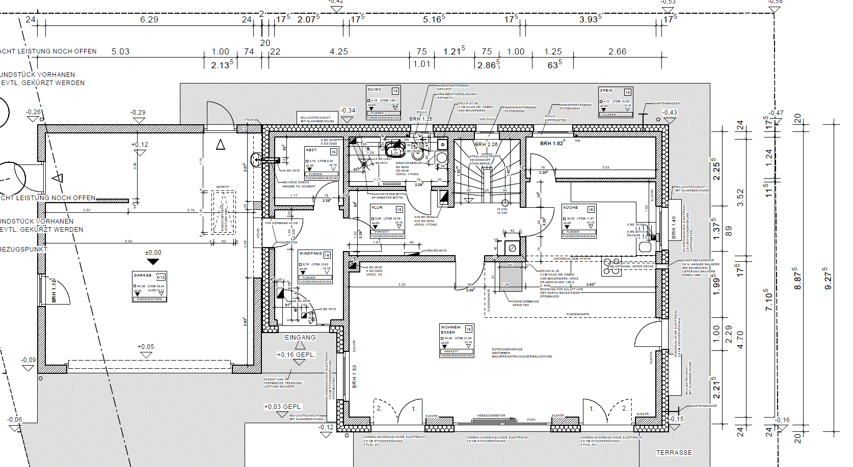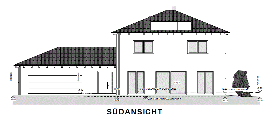 Die Garage mussten wir leider komplett umplanen, da der Geländeverlauf zu einer Garagenhöhe von 3,35m geführt hat und wir somit die Abstandsflächen einhalten mussten.