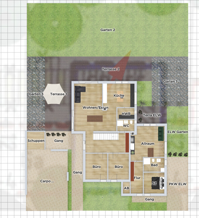wichtigen Kellerräumen mit einer "Hangausgrabung" vor den Fenstern mehr Wohnqualität herzustellen?der Lichthof wäre hier zb die kleine Wiese im Osten über der Einliegerwohnung-Terrasse. Man kann auch im Süden unter den Büros eine Abböschung für einen Lichthof machen. Andre77 schrieb: