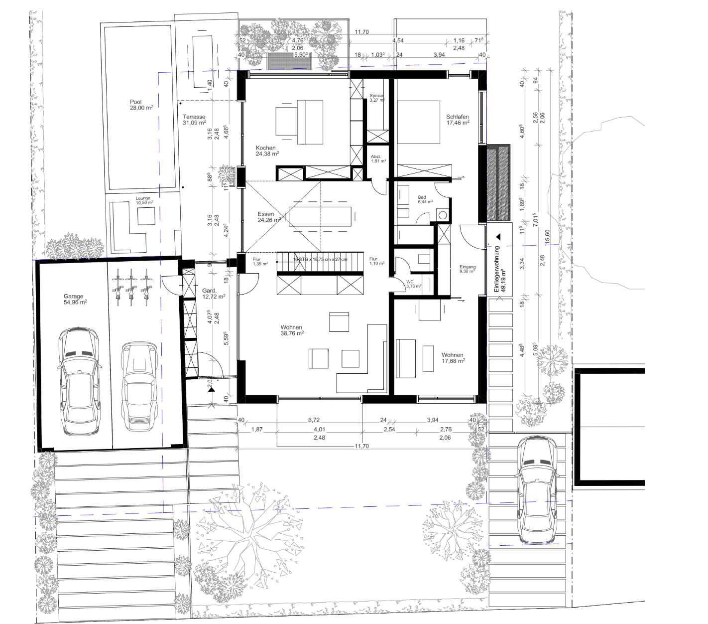 - Kommentar: Wir müssen hier mit unserem Bauamt sprechen. Laut Bebauungsplan müssen Fensterflächen nach 1,5qm unterteilt werden. Deshalb sieht die Front etwas verschachtelt aus.