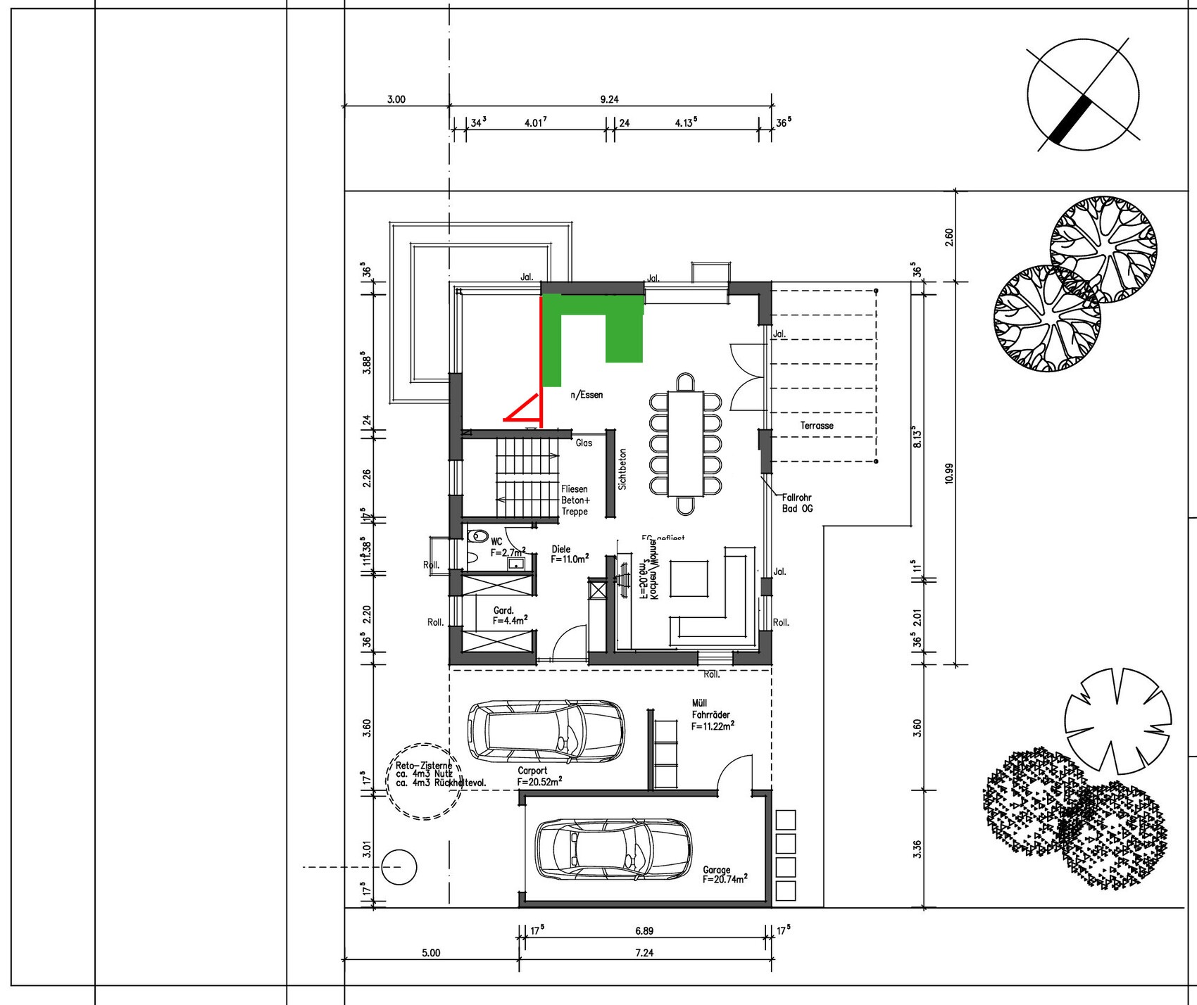 Grundriss Erdgeschoss mit Essbereich (grün-markiert), Küche, Treppe, Terrasse, Carport und Garage.