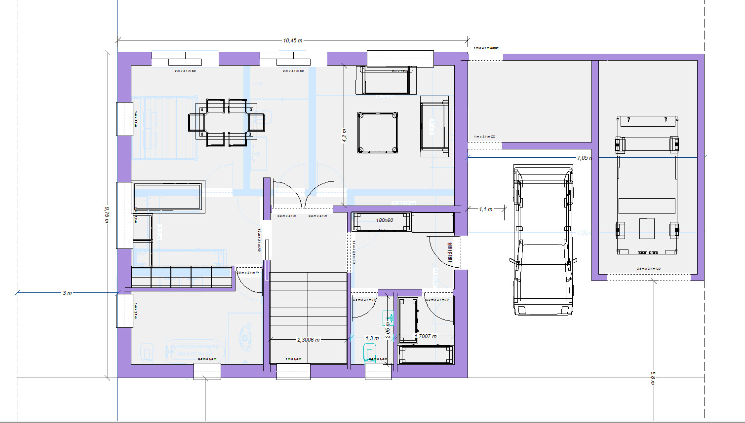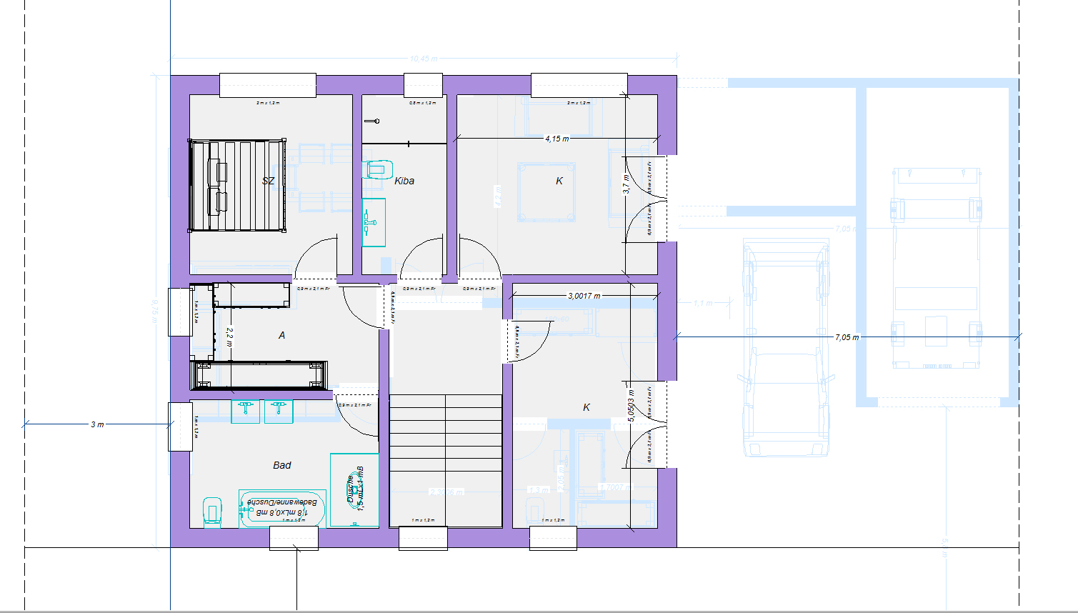 Ich würde die Hausmaße noch etwas verschieben auf 1045x975 damit der Treppenbereich und die WZ-Tiefe etwas gefälliger wird. Außerdem zählt beim Platz neben dem Auto vor der Haustür jeder Zentimeter (m.E. ist das ne Kröte, die ich nur schlucken würde, wenn üblicherweise nur 1 Auto auf dem Grundstück parkt).