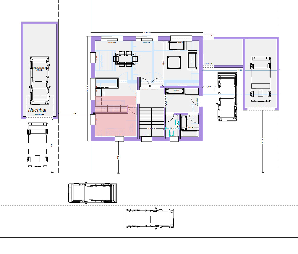 Ich habe das Gefühl, dass die Größe des Grundstücks bei der L-Wohnraum-Diskussion überschätzt wird oder einigen einfach die Übersicht fehlt. Die Ach so ruhige und kuschlige Lage im hinteren L relativiert sich m.E. komplett, wenn man mal die Draufsicht inkl. der zu erwartetenden Randbebauung des Nachbarn dazu einzeichnet.