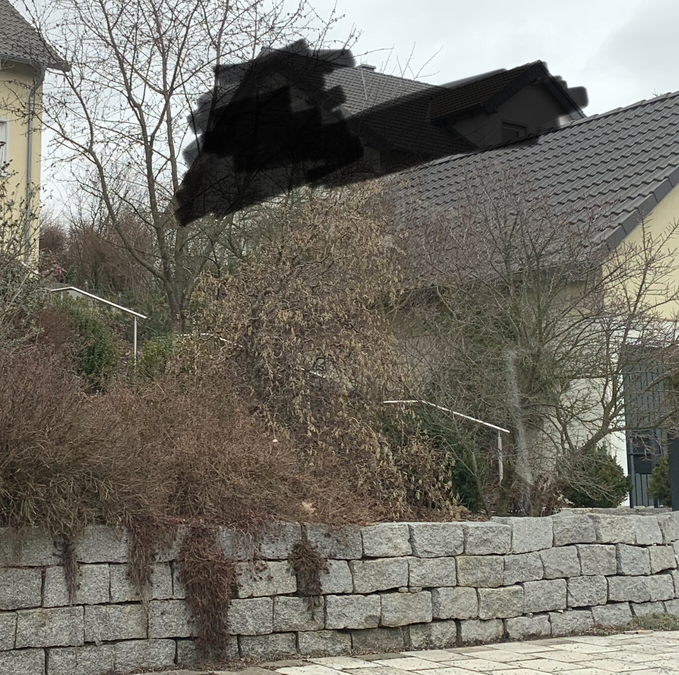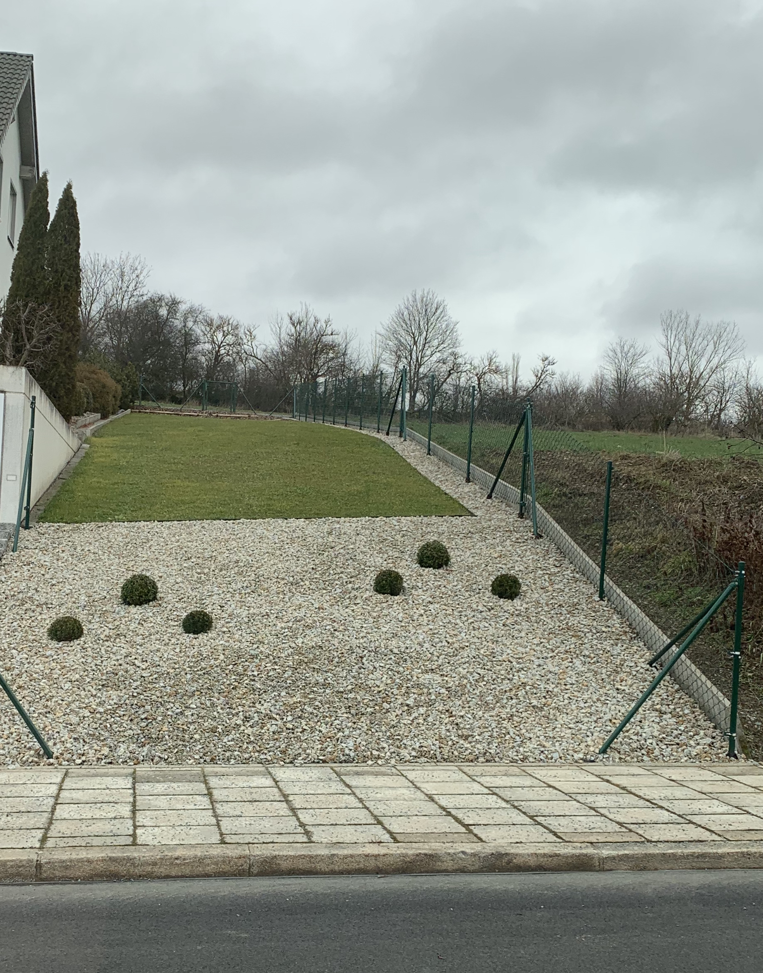 Hier noch mal ein Foto vom linken Nachbargrundstück. Leider stehen mir keine konkreten Meterangaben vom Höhenprofil zur Verfügung. Steht man davon, dann steigt das Grundstück nach fünf Meter Tiefe knapp zwei Meter an, danach wird’s weniger. Ich möchte eine Doppelgarage haben, die ist für mich unabdingbar. Ich mag keine Autos, die im Sommer von Mardern bewandert werden. Optisch gefällt mir die hausintegrierte Lösung am besten. Die Treppen, die alle Nachbarn zum Haus gelegt haben, finde ich suboptimal – auch im Winter. Da verzichte ich gerne auch auf etwas Garten. Dennoch habe ich Euere Tipps (Garagen vorne an der Straße, dadurch breiter Garten im Süden) im Hinterkopf.