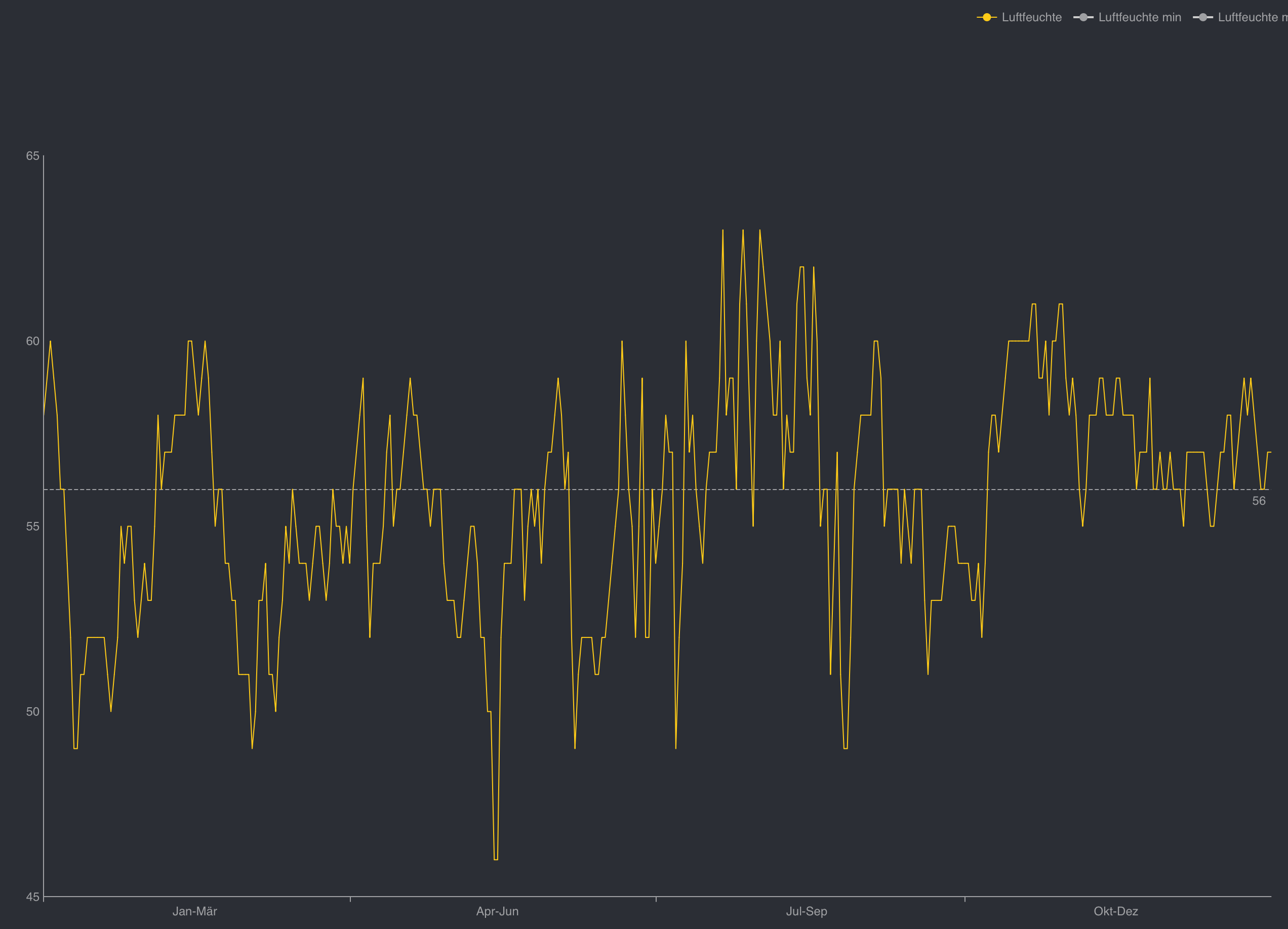 So sah es bei uns letztes Jahr aus - das zackig aussehende Profil bewegt sich zwischen 46 und 63 (und das mit Lo-Tech Heizung und ohne irgendeiner Aufmerksamkeit unsererseits)