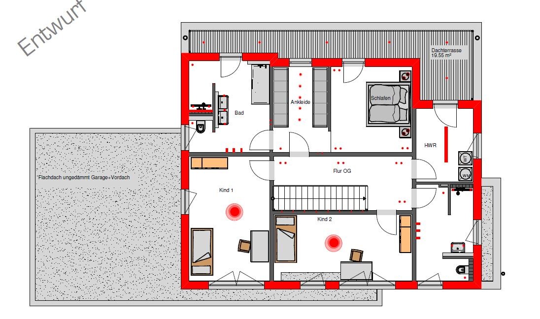 Er hat ganz kleine Nachtlichter in die Wand geplant (Garderobe und Bad). Die wären über Schalter vom Nachttisch zu steuern. Das sehe ich aber persönlich nicht. Entweder ich steuere die Leuchten in der Ankleide über Bewegungsmelder und KNX so, dass sie nachts nur stark gedimmt angehen, wenn man auf Toilette geht oder ich steuere das selbe über Schalter. Aber extra Nachtleuchten dafür finde ich überflüssig. Oder? Im Bad wäre das eine Idee aber ich denke auch nicht zwingend nötig, denn mit Dimmen kann man ja eigentlich alles erreichen, was man möchte.