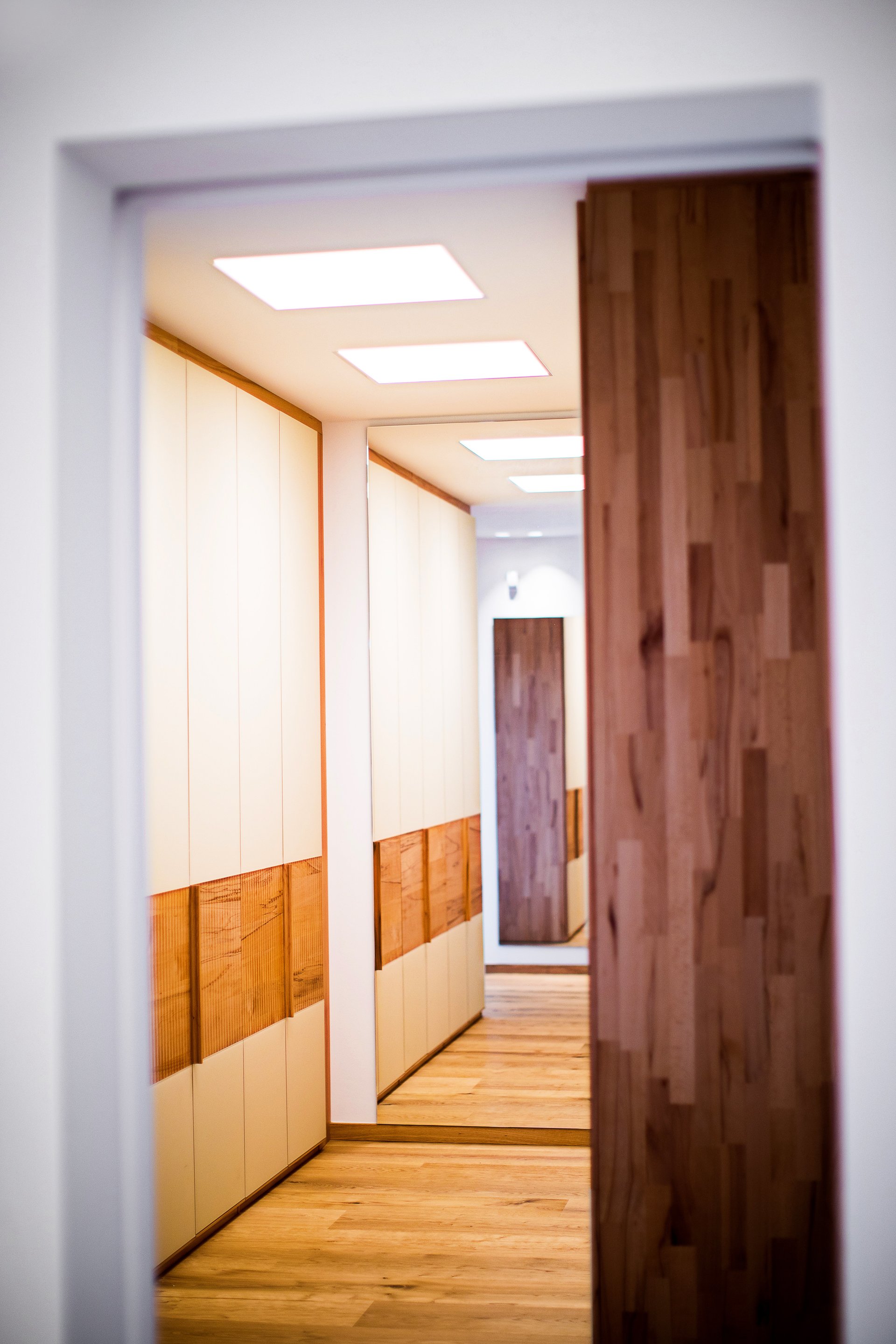 In der Garderobe würde ich glaube ich auf die eingezeichneten Spots verzichten und die Idee des alten Lichtplaners aufgreifen, solche flächenbündigen Deckenlichter zu machen wie ebenfalls in der Anlage abgebildet (auch dort in einer Garderobe). Die Frage wäre sogar, ob diese Leuchten nicht auch für andere Räume interessant sein könnten. Ich denke da an das Büro, auch wenn dann die Anforderung des Lichtplaners, dass die Leuchte an die Decke strahlen soll, nicht erfüllt wäre.